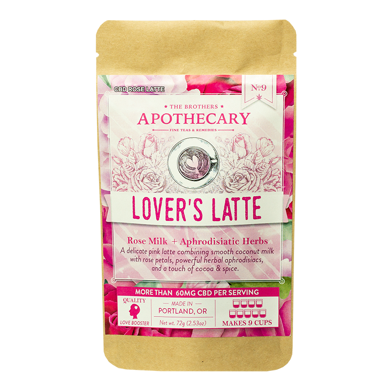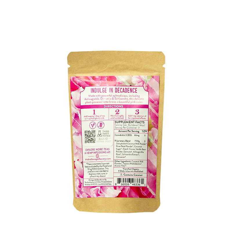 Lover's Latte is a unique, floral, low-caffeine superfood latte. Its flavor is subtle and sweet, with notes of rose petals, coconut, cocoa, and a hint of cinnamon. Its delicate, mildly sweet taste pairs especially well with milk alternatives (water is not recommended). This CBD latte mix can also be whisked in a small bowl with milk or a milk alternative, then poured over milk and ice for a delicious iced rosé latte.