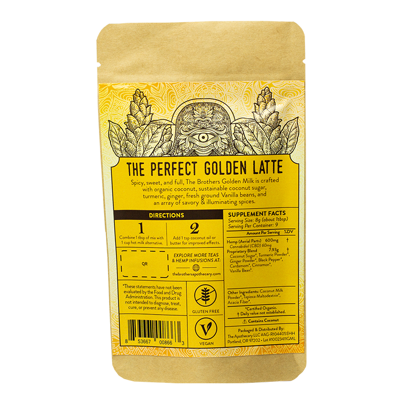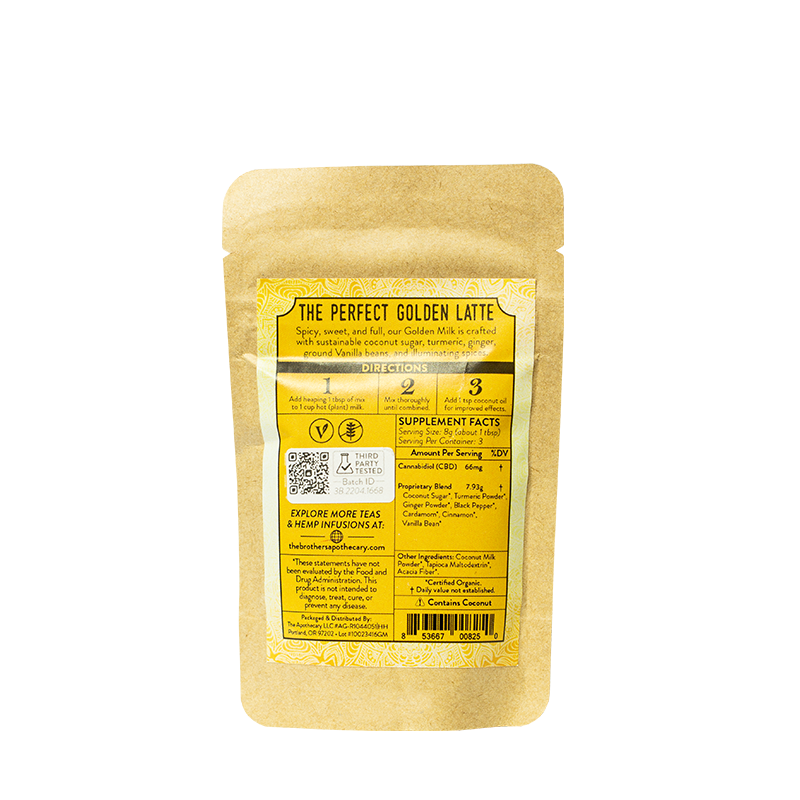 Following that same tradition, we've reinvented Golden Milk and created something unique for The Brothers. Our Golden Milk is an easy-to-make blend of organic coconut milk powder, low-glycemic coconut sugar, fresh organic turmeric, ginger, vibrant vanilla beans, and a variety of flavorful and enlightening spices. We've also added a potent dose of CBD, sourced from US-grown hemp that's been third-party lab-tested for purity.