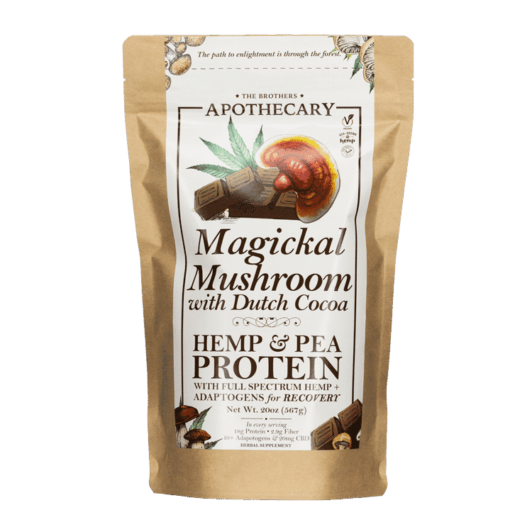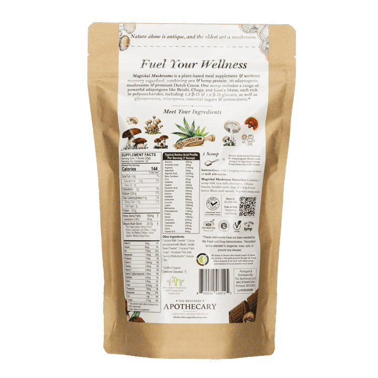 Magickal Mushrooms is a plant-based dietary supplement and post-workout recovery superfood that combines pea and hemp protein, 10 adaptogenic mushrooms, and premium Dutch cacao. This delicious chocolate mushroom CBD protein is packed with potent adaptogens like reishi, chaga, and lion's mane, each rich in polysaccharides, including 1,3-β-D and 1,6-β-D glucans, as well as glycoproteins, triterpenes, essential sugars, and antioxidants.*