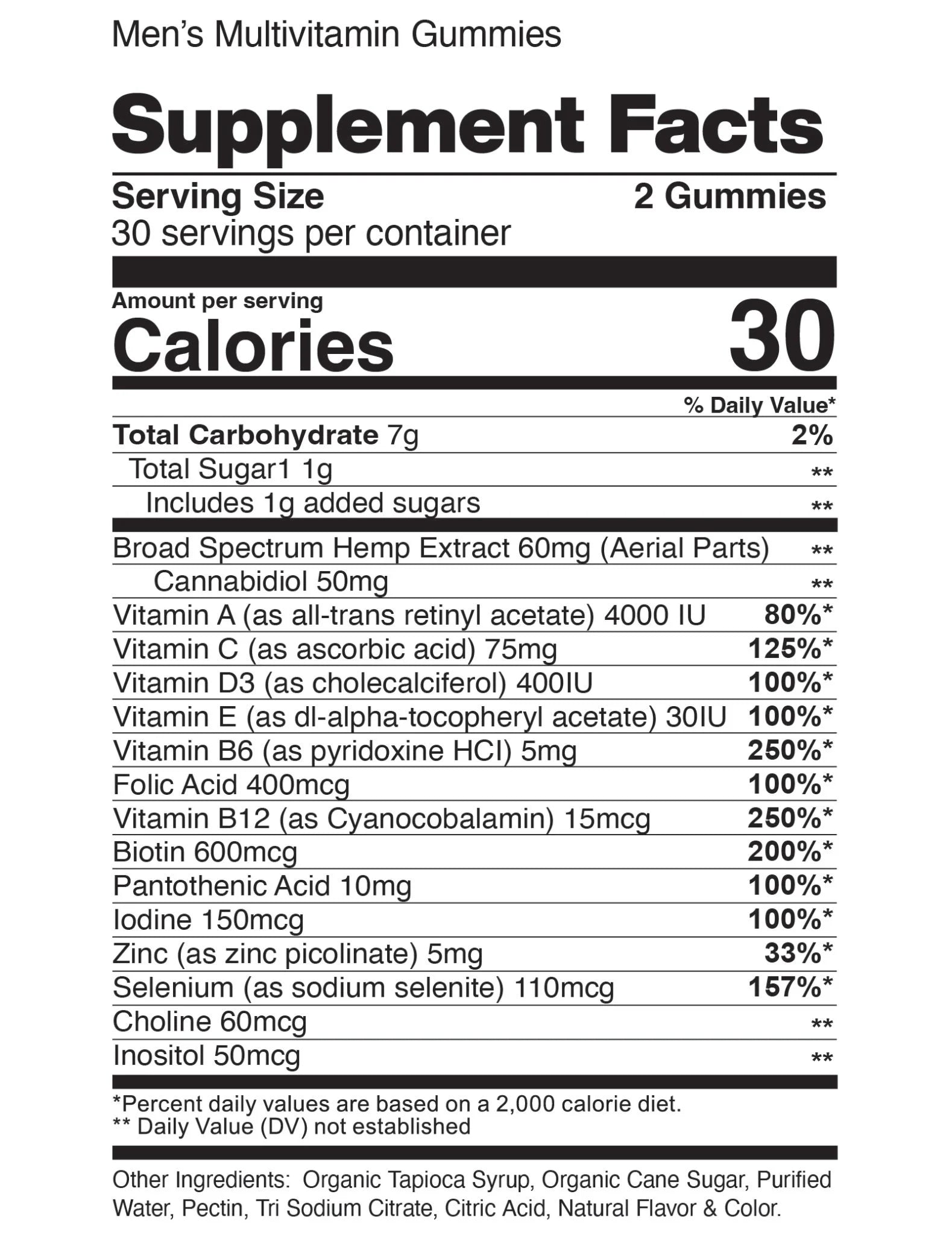 Versión Hombres: Nuestras gomitas multivitamínicas para hombres mezclan CBD de origen orgánico con una variedad de nutrientes esenciales, incluyendo vitaminas A, C, D3, E, complejo B, ácido pantoténico, colina y zinc.