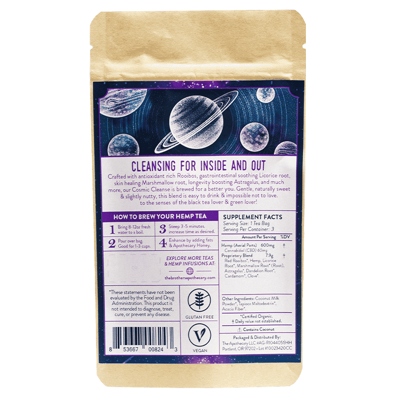 Elaborado con Rooibos (rico en antioxidantes), raíz de Regaliz (que calma el estómago), raíz de Malvavisco (que beneficia la piel y el intestino), el poderoso Astrágalo y mucho más, nuestro Cosmic Cleanse está diseñado para una mejor versión de ti.