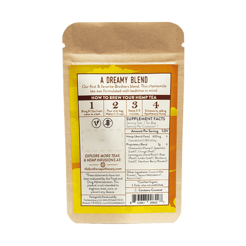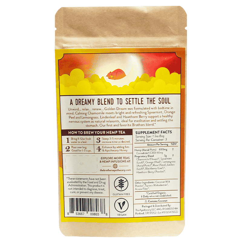 Relájate… renuévate… El Té de Manzanilla con CBD Golden Dream fue formulado pensando en la hora de dormir. La relajante manzanilla se combina con la vibrante y refrescante hierbabuena, cáscara de naranja y limoncillo. La hoja de tilo y las bayas de espino se asientan naturalmente, lo que lo convierte en un té ideal para meditar y calmar el alma.