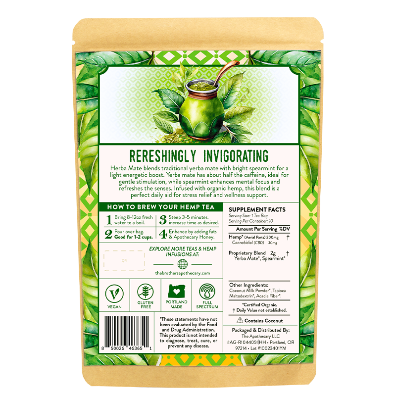 ¡Revitaliza tu día con Herba Mate! Esta mezcla única de Brother's combina yerba mate y hierbabuena orgánica para una energía limpia y concentración. Elaborada con cáñamo orgánico de espectro completo certificado por el USDA, rico en cannabinoides y terpenos. Herba Mate ofrece una experiencia de bebida centrada y concentrada, perfecta para recargar energías por la mañana o para combatir un bajón vespertino. Refrescante, estimulante e inspiradora.