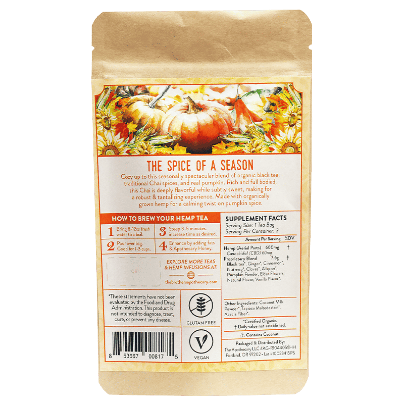Disfruta de esta espectacular mezcla de temporada de té negro orgánico, deliciosas y tradicionales especias Chai y auténtica calabaza. Una experiencia intensa y tentadora que evoca el otoño (¡pero deliciosa todo el año!).
