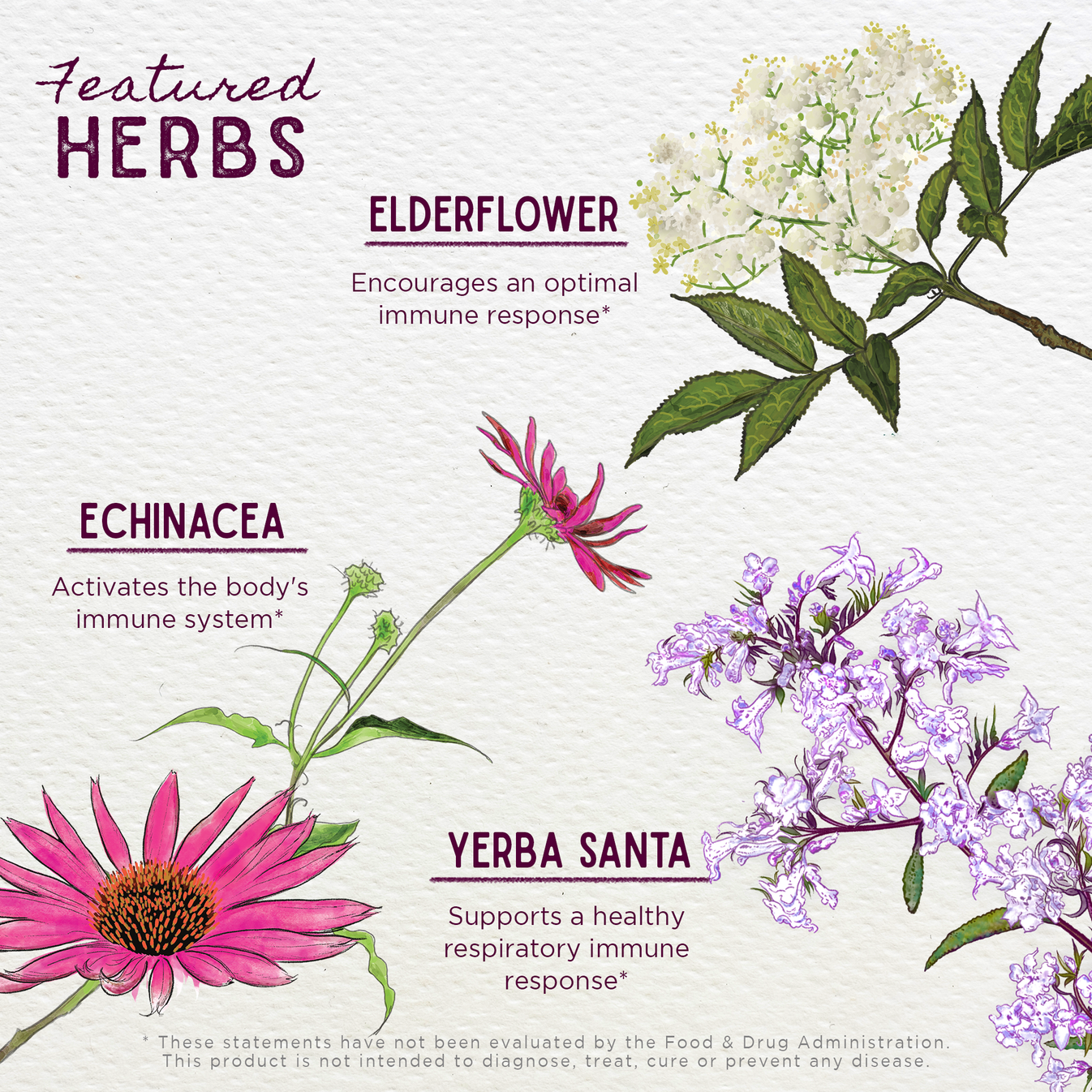 • Flor de Saúco: Sambucus nigra es originaria de Europa y actualmente se encuentra naturalizada en algunas zonas de Estados Unidos. Esta hierba ligera y delicada, con flores de aroma a miel, es ideal tanto para niños como para adultos. La flor de saúco favorece la capacidad natural del cuerpo para eliminar desechos y promueve un equilibrio microbiano y una respuesta inmunitaria saludables. También puede ayudar a mantener una temperatura corporal saludable, aliviar la congestión nasal y favorecer una respuesta inflamatoria saludable en los senos paranasales durante los cambios de estación.