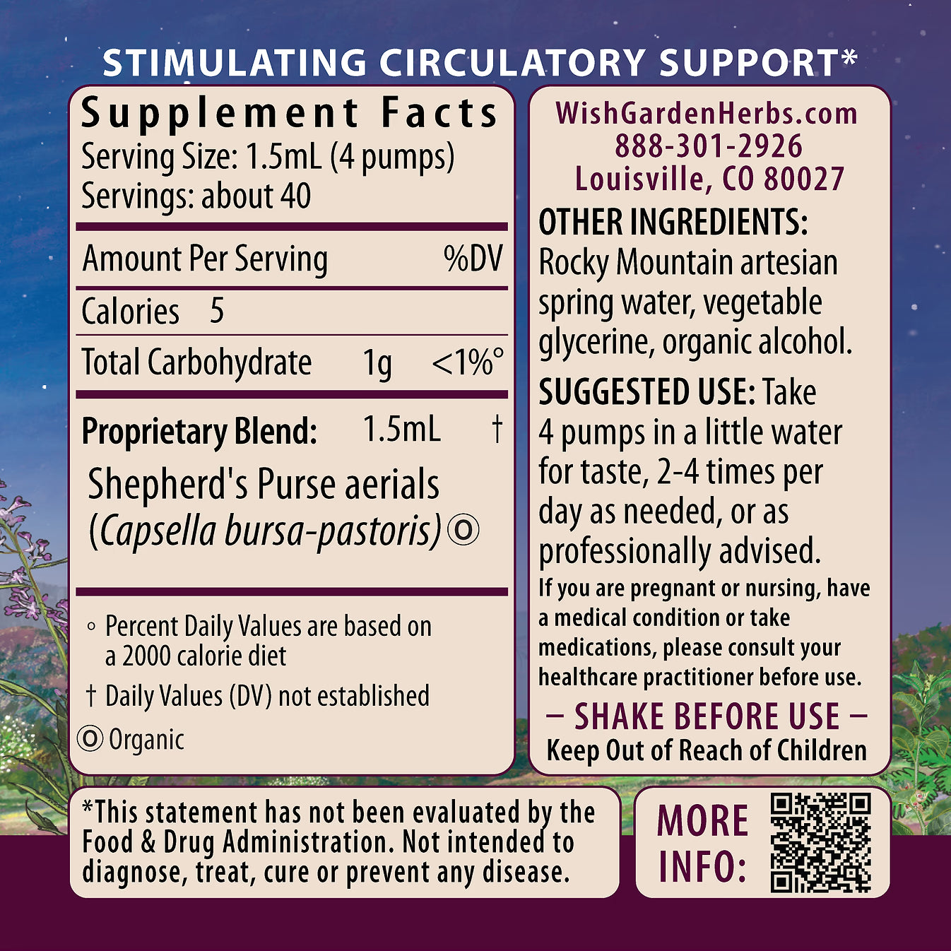 Flores de bolsa de pastor orgánicas (Capsella bursa-pastoris), agua de manantial artesiano de las Montañas Rocosas, glicerina vegetal y alcohol orgánico sin gluten.
